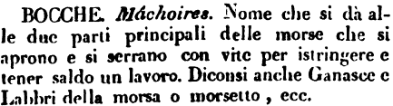 | Bocche - Màchoires. Nome che si dà alle due parti principali delle morse che si aprono e si serrano con vite per istringere e tener saldo un lavoro. Diconsi anche Ganasce e Labbri della morsa o morsetto, ecc. [immagine] |