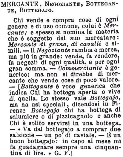 | Mercante, Negoziante, Bottegante, Bottegajo - Chi vende e compra cose di ogni genere e di uso comune, colui è Mercante; e spesso si nomina la materia che è oggetto del suo mercatare: Mercante di grano, di cavalli e simili. – Il Negoziante cambia e merca, ma più in grande: vende, fa vendere, fa negozii di ogni qualità, e per ogni gran somma. - Commerciante è generico; ma non si direbbe di mercante che vende cose di poco valore. - [Bottegante è voce generica che indica Chi ha bottega aperta e vive di quella. Lo stesso vale Bottegajo, ma ha usi speciali, dicendosi in Firenze Bottegajo chi ha bottega di salumiere o di pizzicagnolo e anche Chi è solito servirsi in una bottega. - «Va dal bottegajo a comprar due salsiccie – un po’ di caviale. – E’ un buon bottegajo: in capo al mese mi fa guadagnare sempre una cinquantina di lire. » G. F.] [immagine] |