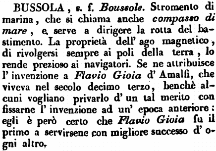 | Bussola - Johanneau dice: «E' certo che l'italiano bussola viene da bossolo, scatola, che deriva da bosso (specie di legno.) Io però credo che la bussola sia anteriore d'assai all'italiano Flavio Gioja, il quale si ritiene l'abbia inventata verso il 1360 in Amalfi nel regno di Napoli.