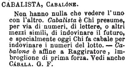 | Cabalista, Cabalone - Non hanno nulla che vedere l'uno con l'altro. Cabalista è Chi presume, per via di numeri, di lettere, o altri mezzi simili, di indovinare il futuro, e specialmente oggi Chi fa cabale per indovinare i numeri del lotto. - Cabalone è affine a Raggiratore, Imbroglione di prima forza. Vedi anche Cábala. G. F. [immagine] |