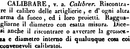 | Calibrare - v. a. Calibrer. Riscontrare il calibro delle artiglierie, e d'ogni altra arma da fuoco, ed i loro proietti. Ragguagliarne il diametro con esatta misura. Dicesi anche il riscontrare o avverare la grossezza e diametro interno di qualunque cosa coi convenevoli calibratoi. [immagine] |