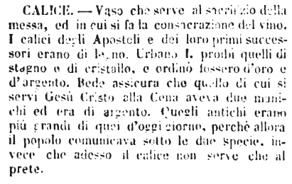 | Calice - Vaso che serve al sacrifizio della messa, ed in cui si fa la consacrazione del vino. I calici degli Apostoli e dei loro primi successori erano di legno. Urbano I. proibì quelli di stagno e di cristallo, e ordinò fossero d'oro e d'argento. Bede assicura che quello di cui si servì Gesù Cristo alla Cena aveva due manichi ed era di argento. Quegli antichi erano più grandi di quei d'oggi giorno, perchè allora il popolo comunicava sotto le due specie. Invece che adesso il calice non serve che al prete. [immagine] |