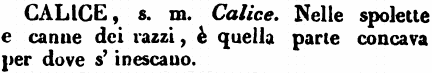 | Calice - s. m. Calice. Nelle spolette e canne dei razzi, è quella parte concava per dove s'inescano. [immagine] |