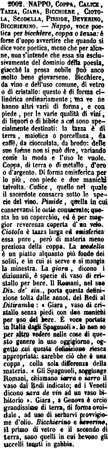 | Nappo, Coppa, Calice, Tazza, Giara, Bicchiere, Ciotola, Scodella, Pisside, Beverino, Bicchierino - Nappo, voce poetica per bicchiere, coppa o tazza: è forse d'uopo avvertire che quando si dice voce poetica, meno che per alcune, non s'intende che essa sia esclusivamente del dominio della poesia, giacchè la prosa nobile può anco molto bene giovarsene. Bicchiere, da vino e dell'uso comune, di vetro o di cristallo: questo è di forma cilindrica ordinariamente; ma ve ne hanno altri varii di forma, e con piede, per le varie qualità di vini, di liquori o di bibite a cui sono specialmente destinati: la tazza è di terra, maiolica o porcellana, da caffè, da cioccolata, da brodo: delle sue forme non si può dire, variando come la moda e l'uso le vuole. Coppa, di terra o di metallo, d'oro o d'argento. Di forma emisferica per lo più, con piede e due manichi talvolta. Calice, quello nel quale il sacerdote consacra sotto le specie del vino. Pisside, quella in cui conservansi le ostie consacrate; questa ha un coperchio, ed è per maggior reverenza coperta d'un velo. Ciotola è tazza larga ed emisferica essa pure, però di materia meno preziosa della coppa. La scodella è un piatto alquanto più fondo dei soliti, e in cui si serve e si mangia la minestra. La giara, dicono i dizionarii, è specie di vaso di cristallo per bere. Il Romani, nel suo Diz. de' sin. porta questa definizione tolta dalle annot. del Redi al Ditirambo: « Giara, vaso di cristallo senza piedi con due manichi per uso del bere. È voce portata in Italia dagli Spagnuoli ». Io non so per altro vedere nelle cose di questo genere in uso oggigiorno, oggetto cui questa definizione riesca appropriata: sarebbe ciò che è una coppa, colla sola differenza della materia. « Gli Spagnuoli, soggiunge Romani, chiamano iarra o iarro il vaso dal Redi indicato; ed i Veneti dicono zara de vin ad un vaso bibitorio ». Giara, a Genova è orcio grandissimo di terra, di forma ovoidale, ad uso di serbarvi provvigione d'olio. Bicchierino e beverino, il primo di vetro e il secondo di terra, sono quelli in cui bevono gli uccelli tenuti in gabbia. [immagine] |