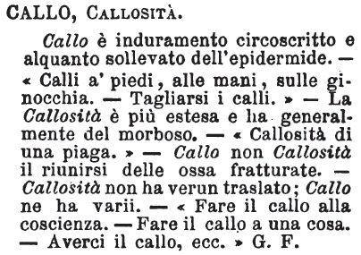 Callo, Callosità - Callo è induramento circoscritto e alquanto sollevato dell'epidermide. - «Calli a' piedi, alle mani, sulle ginocchia. - Tagliarsi i calli.» - La Callosità è più estesa e ha generalmente del morboso. - «Callosità di una piaga.» - Callo non Callosità il riunirsi delle ossa fratturate. - Callosità non ha verun traslato; Callo ne ha varii. - «Fare il callo alla coscienza. - Fare il callo a una cosa. - Averci il callo. ecc.» G. F. [immagine]