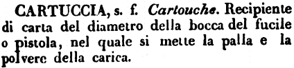 | Cartuccia - s. f. Cartouche. Recipiente di carta del diametro della bocca del fucile o pistola, nel quale si mette la palla e la polvere della carica. [immagine] |