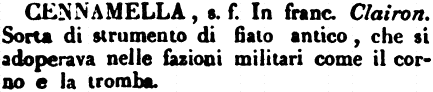 Cennamella - s. f. In franc. Clairon. Sorta di strumento di fiato antico, che si adoperava nelle fazioni militari come il corno e la tromba. [immagine]