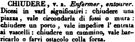 | Chiudere - v. a. Enfermer, entourer. Dicesi in vari significativi: chiudere una piazza, vale circondarla di fossi o mura: chiudere un porto, vale impedire l'entrata ai vascelli: chiudere un cammino, vale barricarlo o farvi ostacolo colla forza. [immagine] |