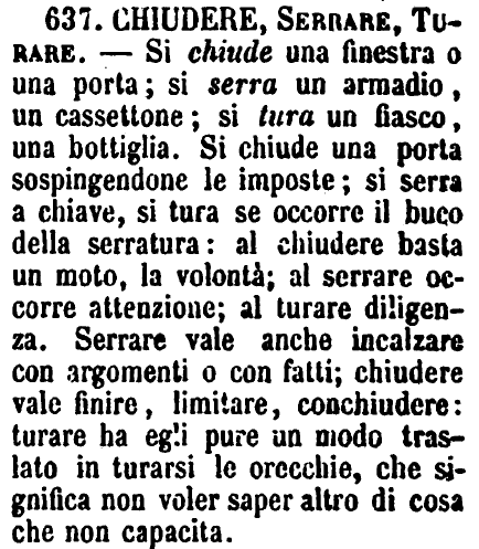 | Chiudere, Serrare, Turare - Si chiude una finestra o una porta; si serra un armadio, un cassettone; si tura un fiasco, una bottiglia. Si chiude una porta sospingendone le imposte; si serra una chiave, si tura se occorre il buco della serratura: al chiudere basta un moto, la volontà; al serrare occorre attenzione; al turare diligenza. Serrare vale anche incalzare con argomenti o con fatti; chiudere vale finire, limitare, conchiudere: turare ha egli pure un modo traslato in turarsi le orecchie, che significa non voler saper altro di cosa che non capacita. [immagine] |