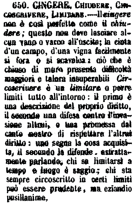 | Cingere, Chiudere, Circoscrivere, Limitare - Il cingere non è così perfetto come il chiudere; questo non deve lasciare alcun vano o varco all'uscita; la cinta d'un campo, d'una vigna facilmente si fora e si scavalca; ciò che è chiuso di muro presenta difficoltà maggiori e talora insuperabili Circoscrivere è un limitare o porre limiti tutto all'intorno: il primo è una descrizione del proprio diritto, il secondo una difesa contro l'invasione altrui, o una promessa dal canto nostro di rispettare l'altrui diritto: uno segna la cosa acquisita, il secondo la difende, astrattamente parlando, chi sa limitarsi a tempo e luogo è saggio; chi sta sempre circoscritto in certi limiti può essere prudente, ma eziandio pusillanime. [immagine] |