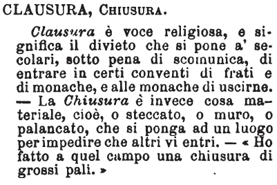| Clausura, Chiusura - Clausura è voce religiosa, e significa il divieto che si pone a' secolari, sotto pena di scomunica, di entrare in certi conventi di frati e di monache, e alle monache di uscirne. - La Chiusura è invece una cosa materiale, cioè, o steccato, o muro, o palancato, che si ponga ad un luogo per impedire che altri vi entri. - «Ho fatto a quel campo una chiusura di grossi pali.» [immagine] |