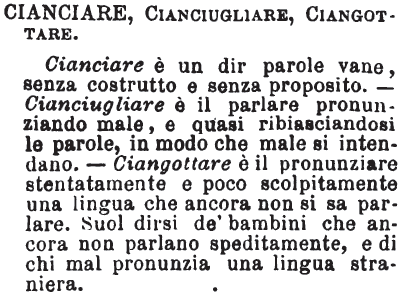 Cianciare, Cianciugliare, Ciangottare - Cianciare è un dir parole vane, senza costrutto e senza proposito. - Cianciugliare è il parlare pronunziando male, e quasi ribiasciandosi le parole, in modo che male si intendano. - Ciangottare è il pronunziare stentatamente e poco scolpitamente una lingua che ancora non si sa parlare. Suol dirsi de' bambini che ancora non parlano speditamente, e di chi mal pronunzia una lingua straniera. [immagine]