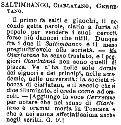 | Ciarlatano - S. m. Cerretano, Cantambanco. T. Da CIARLARE. = Red. Esp. nat. 12. (C) I ciarlatani, per dare a vedere la potenza ed il valore de' loro antidoti, mangiano li scorpioni, e i capi delle vipere. E altrove: Che quei… sieno della stessa razza de' nostri ciarlatani e cantambanchi. E cons. 1. 21. Molto più dee astenersi da quei medicamenti che con encomii di miracoli, e con nomi di segreti reconditi sogliono essere proposti giornalmente e celebrati da' ciarlatani, e dal volgo ignorante.