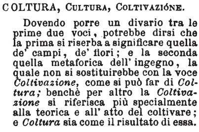 Coltura, Cultura, Coltivazione - Dovendo porre un divario tra le prime due voci, potrebbe dirsi che la prima si riserba a significare quella de' campi, de' fiori; e la seconda quella metaforica dell'ingegno, la quale non si sostituirebbe con la voce Coltivazione, come si può far di Coltura; benchè per altro la Coltivazione si riferisca più specialmente alla teorica e all'atto del coltivare; e Coltura sia come il risultato di essa. [immagine]