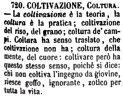 Coltivazione, Coltura - La coltivazione è la teoria, la coltura è la pratica; coltivazione del riso, del grano; coltura de' campi. Coltura ha senso traslato, che coltivazione non ha; coltura della mente, del cuore: coltivare però ha questo stesso senso, poichè si dice: chi non coltiva l'ingegno da giovine, riesce goffo, ignorante, zotico per tutta la vita. [immagine]