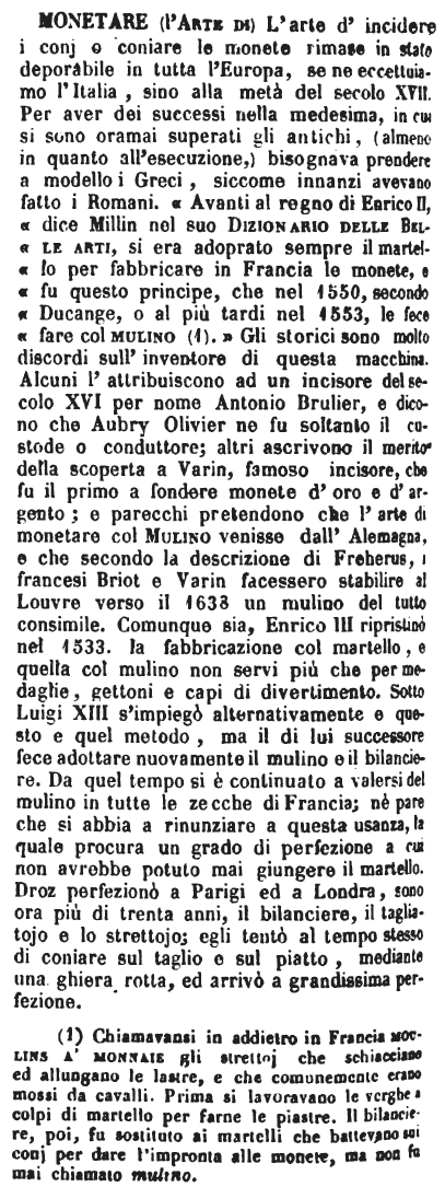 | Monetare (L’arte di) - L'arte d'incidere i conj o coniare le monete rimase in stato deporabile in tutta l'Europa, se ne eccettuiamo l'Italia, sino alla metà del secolo XVII. Per aver dei successi nella medesima, in cui si sono oramai superati gli antichi,(almeno in quanto all'esecuzione,) bisognava prendere a modello i Greci, siccome innanzi avevano fatto i Romani. « Avanti al regno di Enrico II, dice Millin nel suo Dizionario delle Belle arti, si era adoprato sempre il martello per fabbricare in Francia le monete, e fu questo principe, che nel 1550, secondo Ducange, o al più tardi nel 1553, le fece fare col mulino (1).» Gli storici sono molto discordi sull'inventore di questa macchina. Alcuni l'attribuiscono ad un incisore del secolo XVI per nome Antonio Brulier, e dicono che Aubry Olivier ne fu soltanto il custode o conduttore; altri ascrivono il merito della scoperta a Varin, famoso incisore, che fu il primo a fondere monete d'oro e d'argento; e parecchi pretendono che l'arte di monetare col Mulino venisse dall'Alemagna, e che secondo la descrizione di Freherus, i francesi Briot e Varin facessero stabilire al Louvre verso il 1638 un mulino del tutto consimile. Comunque sia, Enrico III ripristinò nel 1533. la fabbricazione col martello, e quella col mulino non servi più che per medaglie, gettoni e capi di divertimento. Sotto luigi XIII s'impiegò alternativamente e questo e quel metodo, ma il di lui successore fece adottare nuovamente il mulino ed il bilanciere. Da quel tempo si è continuato a valersi del mulino in tutte le zecche di Francia; nè pare che si abbia a rinunziare a questa usanza, la quale procura un grado di perfezione a cui non avrebbe potuto mai giungere il martello. Droz perfezionò a Parigi ed a Londra, sono ora più di trenta anni, il bilanciere, il tagliatojo e lo strettojo; egli tentò al tempo stesso di coniare sul taglio e sul piatto, mediante una ghiera rotta, ed arrivò a grandissima perfezione.