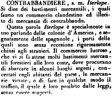 Questa parola Iterlope è specialmente in uso parlando delle colonie d'America, e segnatamente delle spagnuole, i porti delle quali sono senza eccezione rigorosamente chiusi agli stranieri. Il commercio lucroso, che vi si fa attrae molti bastimenti mercantili forestieri alle loro coste, dove procurano di sbarcare in alcuni luoghi segreti, concertati cogli abitanti del paese, le mercanzie vietate, o di fare in qualche modo il traffico, il quale è loro proibito dalle leggi, senza essere scoperti. [immagine] |