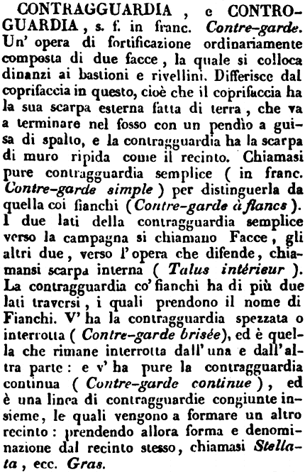 | Contragguardia, e Controguardia - s. f. in franc. Contre-garde. Un'opera di fortificazione ordinariamente composta di due facce, la quale si colloca dinanzi ai bastioni e rivellini. Differisce dal coprifaccia in questo, cioè che il coprifaccia ha la sua scarpa esterna fatta di terra, che va a terminare nel fosso con un pendìo a guisa di spalto, e la contragguardia ha la scarpa di muro ripida come il recinto. Chiamasi pure contragguardia semplice (in franc. Contre-garde simple) per distinguerla da quella coi fianchi (Contre-garde à flancs). I due lati della contragguardia semplice verso la campagna si chiamano Facce, gli altri due, verso l'opera che difende, chiamansi scarpa interna (Talus intérieur). La contragguardia co' fianchi ha di più due lati traversi, i quali prendono il nome di Fianchi. V'ha la contragguardia spezzata o interrotta (Contre-garde brisée), ed è quella che rimane interrotta dall'una e dall'altra parte: e v'ha pure la contragguardia continua (Contre-garde continue), ed è una linea di contragguardie congiunte insieme, le quali vengono a formare un altro recinto: prendendo allora forma e denominazione dal recinto stesso, chiamasi Stellata, ecc. Gras. [immagine] |