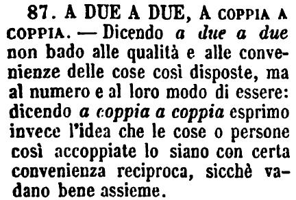 | A due a due, A coppia a coppia - Dicendo a due a due non bado alle qualità e alle convenienze delle cose così disposte, ma al numero e al loro modo di essere: dicendo a coppia a coppia esprimo invece l'idea che le cose o persone così accoppiate lo siano con certa convenienza reciproca, sicchè vadano bene assieme. [immagine] |