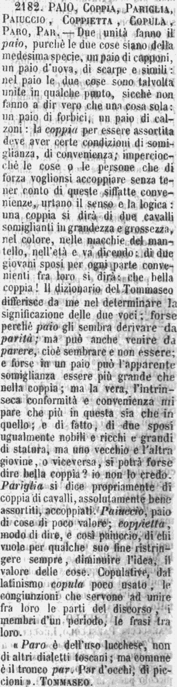 «Paro è dell'uso lucchese, non di altri dialetti toscani; ma comune è il tronco par. Par d'occhi, di piccioni». Tommaseo. [immagine] |