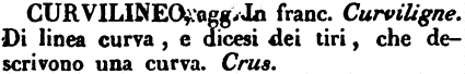 | Curvilineo - agg. In franc. Curviligne. Di linea curva, e dicesi dei tiri, che descrivono una curva. Crus. [immagine] |