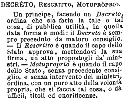 | Decreto, Rescritto, Motuproprio - Un principe, facendo un Decreto, ordina che sia fatta la tale o tal cosa, di pubblica utilità, in quella data forma e modi: il Decreto è sempre preceduto da maturo consiglio. - Il Rescritto è quando il capo dello Stato approva, mettendovi la sua firma, un atto propostogli da' ministri. - Motuproprio è quando il capo dello Stato, senza precedente consiglio, e senza intervento dei ministri, ordina, con puro atto della volontà propria, che si faccia tal cosa, o dà ufficii, titoli ed onorificenze. [immagine] |