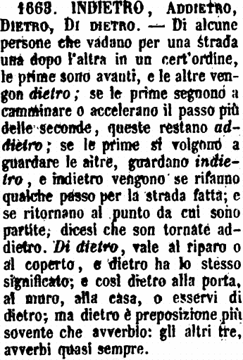 | Dietro, Indietro, Addietro, Di dietro - Dietro indica stato e moto. - «Andar dietro a uno. - Il forno è dietro casa.» - Il modo Di dietro accenna solamente stato o quiete, e si dice per rispetto a Davanti. - «La parte di dietro, e la parte d'avanti.» Se ne fa anche il sostantivo: «Il didietro, il davanti.» - Il modo Indietro accenna a retrocessione. - «Si tiri un pò più indietro. - Tornò indietro colle trombe nel sacco.» - Lo stesso significa Addietro, ma forse con idea di spazio minore; e in una calca si odono spesso i soldati dire alla gente accalcata: Addietro; per invitarla a retrocedere qualche poco e far luogo a chi passa. [immagine] |