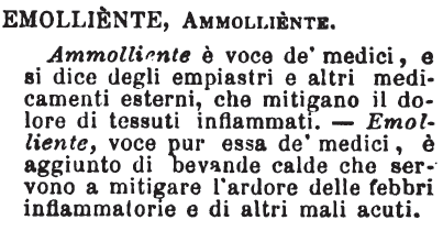 | Emolliente, Ammolliente - Ammoliente è voce de' medici, e si dice degli empiastri e altri medicamenti esterni, che mitigano il dolore di tessuti infiammati. - Emolliente, voce pur essa de' medici, è aggiunto di bevande calde che servono a mitigare l'ardore delle febbri infiammatorie e di altri mali acuti. [immagine] |