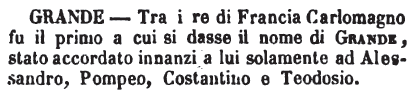 | Grande - Tra i re di Francia Carlomagno fu il primo a cui si dasse il nome di Grande, stato accordato innanzi a lui solamente ad Alessandro, Pompeo, Costantino e Teodosio. [immagine] |