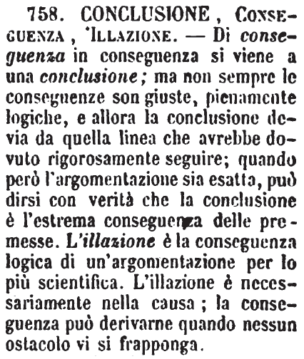 | Conclusione, Conseguenza, Illazione - Di conseguenza in conseguenza si viene a una conclusione; ma non sempre le conseguenze son giuste, pienamente logiche, e allora la conclusione devia da quella linea che avrebbe dovuto rigorosamente seguire; quando però l'argomentazione sia esatta, può dirsi con verità che la conclusione è l'estrema conseguenza delle premesse. L'illazione è la conseguenza logica di un'argomentazione per lo più scientifica. L'illazione è necessariamente nella causa; la conseguenza può derivarne quando nessun ostacolo vi si frapponga. [immagine] |
