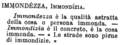 | Immondezza, Immondizia - Immondezza è la qualità astratta della cosa o persona immonda. - Immondizia è il concreto, è la cosa immonda. - «Le strade sono piene di immondizie.» [immagine] |