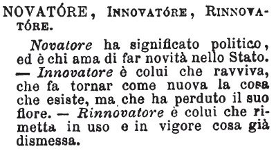 | Novatore, Innovatore, Rinnovatore - Novatore ha significato politico, ed è chi ama di far novità nello Stato. - Innovatore è colui che ravviva, che fa tornar come nuova la cosa che esiste, ma che ha perduto il suo fiore. - Rinnovatore è colui che rimetta in uso e in vigore cosa già dismessa. [immagine] |