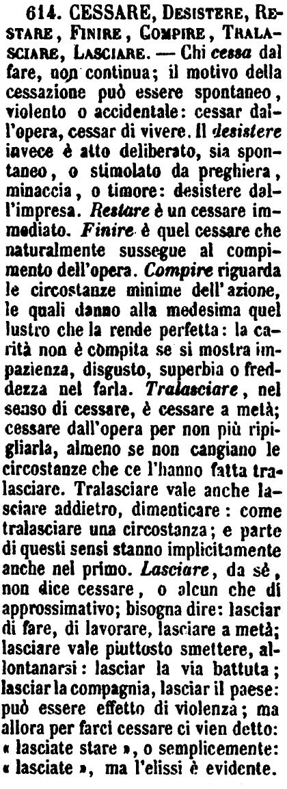 | Cessare, Desistere, Restare, Finire, Compire, Tralasciare, Lasciare - Chi cessa dal fare, non continua; il motivo della cessazione può essere spontaneo, violento o accidentale: cessar dall'opera, cessar di vivere. Il desistere invece è atto deliberato, sia spontaneo, o stimolato da preghiera, minaccia, o timore: desistere dall'impresa. Restare è un cessare immediato. Finire è quel cessare che naturalmente sussegue al compimento dell'opera. Compire riguarda le circostanze minime dell'azione, le quali danno alla medesima quel lustro che la rende perfetta: la carità non è compita se si mostra impazienza, disgusto, superbia o freddezza nel farla. Tralasciare, nel senso di cessare, è cessare a metà; cessare dall'opera per non più ripigliarla, almeno se non cangiano le circostanze che ce l'hanno fatta tralasciare. Tralasciare vale anche lasciare addietro, dimenticare: come tralasciare una circostanza; e parte di questi sensi stanno implicitamente anche nel primo. Lasciare, da sè, non dice cessare, o alcun che di approssimativo; bisogna dire: lasciar di fare, di lavorare, lasciare a metà; lasciare vale piuttosto smettere, allontanarsi: lasciar la via battuta; lasciar la compagnia, lasciar il paese: può essere effetto di violenza; ma allora per farci cessare ci vien detto: «lasciate stare», o semplicemente: «lasciate», ma l'elissi è evidente. [immagine] |