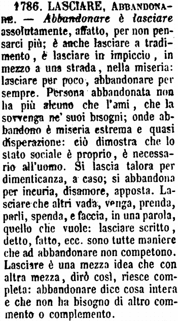 «La principal distinzione di questi due verbi sta in questo, che Abbandonare è lasciar per affatto, e Lasciare è per a tempo. Nell'Abbandonare si ha intenzione di non ripigliare o di non ritornare più alla cosa che si abbandona; nel lasciare non si perde la volontà o la speranza di trovarla. Si lascia un amico, ed è per pochi momenti, onde ritornare a lui fra non molto; ma se si abbandona, è segno che gli si son volte le spalle, e che l'amicizia è rotta.