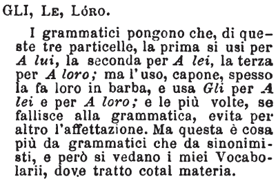 | Gli, Le, Loro - I grammatici pongono che, di queste tre particelle, la prima si usi per A lui, la seconda per A lei, la terza per A loro; ma l'uso, capone, spesso la fa loro in barba, e usa Gli per A lei e per A loro; e le più volte, se fallisce alla grammatica, evita per altro l'affettazione. Ma questa è cosa più da grammatici che da sinonimisti, e però si vedano i miei Vocabolarii, dove tratto cotal materia. [immagine] |