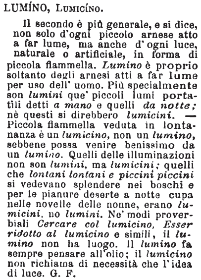 | Lumino, Lumicino - Il secondo è più generale, e si dice, non solo d'ogni piccolo arnese atto a far lume, ma anche d'ogni luce, naturale o artificiale, in forma di piccola fiammella. Lumino è proprio soltanto degli arnesi atti a far lume per uso dell'uomo. Più specialmente son lumini que' piccoli lumi portatili detti a mano e quelli da notte; nè questi si direbbero lumicini. - Piccola fiammella veduta in lontananza è un lumicino, non un lumino, sebbene possa venire benissimo da un lumino. Quelli delle illuminazioni non son lumini, ma lumicini; quelli che lontani lontani e piccini piccini si vedevano splendere nei boschi e per le pianure deserte a notte cupa nelle novelle delle nonne, erano lumicini, no lumini. Ne' modi proverbiali Cercare col lumicino, Esser ridotto al lumicino e simili, il lumino non ha luogo. Il lumino fa sempre pensare all'olio; il lumicino non richiama di necessità che l'idea di luce. G. F. [immagine] |