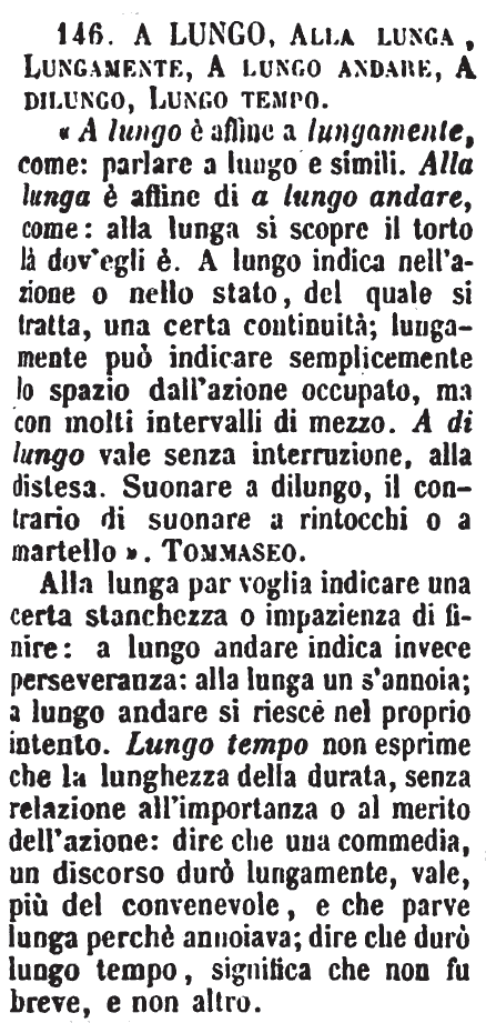 A lungo, Alla lunga, Lungamente, A lungo andare, A dilungo, Lungo tempo - «A lungo è affine a lungamente, come: parlare a lungo e simili. Alla lunga è affine di a lungo andare, come: alla lunga si scopre il torto là dov'egli è. A lungo indica nell'azione o nello stato, del quale si tratta, una certa continuità; lungamente può indicare semplicemente lo spazio dall'azione occupato, ma con molti intervalli di mezzo. A di lungo vale senza interruzione, alla distesa. Suonare a dilungo, il contrario di suonare a rintocchi o a martello». Tommaseo.