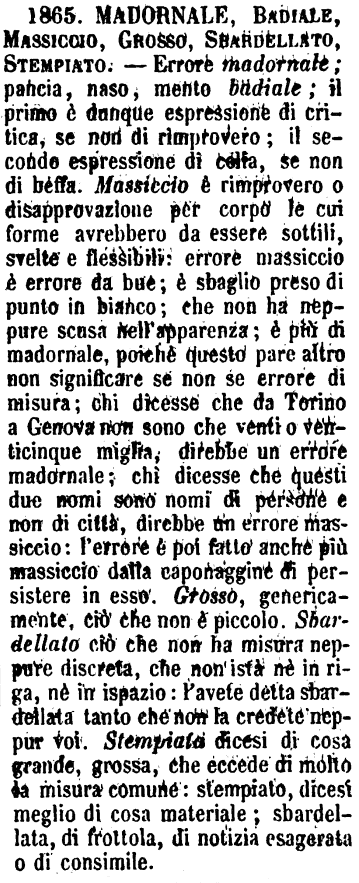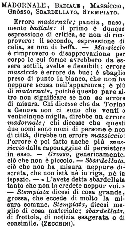| Madornale, Badiale, Massiccio, Grosso, Sbardellato, Stempiato - Errore madornale; pancia, naso, mento badiale; il primo è dunque espressione di critica, se non di rimprovero; il secondo espressione di celia, se non di beffa. Massiccio è rimprovero o disapprovazione per corpo le cui forme avrebbero da essere sottili, svelte e flessibili: errore massiccio è errore da bue; è sbaglio preso di punto in bianco; che non ha neppure scusa nell'apparenza; è più di madornale, poichè questo pare altro non significare se non se errore di misura; chi dicesse che da Torino a Genova non sono che venti o venticinque miglia, direbbe un errore madornale; chi dicesse che questi due nomi sono nomi di persone e non di città, direbbe un errore massiccio: l'errore è poi fatto anche più massiccio dalla caponaggine di persistere in esso. Grosso, genericamente, ciò che non è piccolo. Sbardellato ciò che non ha misura neppure discreta, che non istà nè in riga, nè in ispazio: l'avete detta sbardellata tanto che non la credete neppur voi. Stempiata dicesi di cosa grande, grossa, che eccede di molto la misura comune: stempiato, dicesi meglio di cosa materiale; sbardellata, di frottola, di notizia esagerata o di consimile. [immagine] |