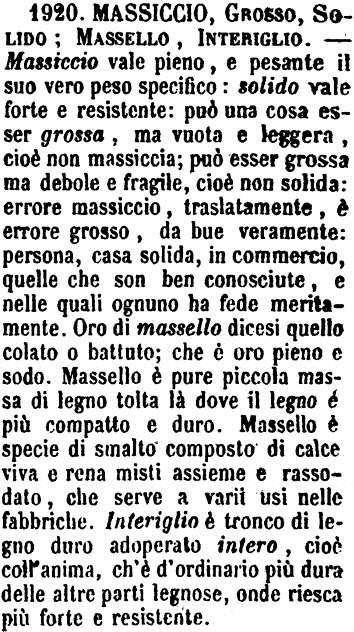 | Massiccio, Grosso, Solido, Massello, Interiglio - Massiccio vale pieno, e pesante il suo vero peso specifico: solido vale forte e resistente: può una cosa esser grossa, ma vuota e leggera, cioè non massiccia; può esser grossa ma debole e fragile, cioè non solida: errore massiccio, traslatamente, è errore grosso, da bue veramente: persona, casa solida, in commercio, quelle che son ben conosciute, e nelle quali ognuno ha fede meritamente. Oro di massello dicesi quello colato o battuto; che è oro pieno e sodo. Massello è pure piccola massa di legno tolta là dove il legno è più compatto e duro. Massello è specie di smalto composto di calce viva e rena misti assieme e rassodato, che serve a varii usi nelle fabbriche. Interiglio è tronco di legno duro adoperato intero, cioè coll'anima, ch'è d'ordinario più dura delle altre parti legnose, onde riesca più forte e resistente. [immagine] |