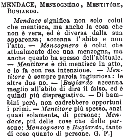 Mendace, Menzognero, Mentitore, Bugiardo - Mendace significa non solo colui che mentisce, ma anche la cosa che non è vera, ed è diversa dalla sua apparenza; accenna l'abito e non l'atto. - Menzognero è colui che attualmente dice una menzogna, ma anche questo ha spesso dell'abituale. - Mentitore è chi mentisce in atto, e lo fa con rea intenzione. - Mentitore è sempre parola ingiuriosa: le altre due no. - [Bugiardo accenna meglio all'abito di dire il falso, ed è quindi più dispregiativo. - Di bambini però, non cadrebbero opportuni i primi. - Mentitore più spesso, anzi quasi solamente, di persone; Mendace, più delle cose che delle persone; Menzognero e Bugiardo, tanto di cose quanto di persone. G. F.] [immagine]