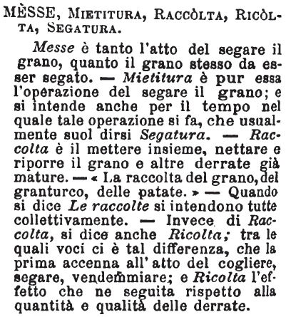 | Messe, Mietitura, Raccolta, Ricolta, Segatura - Messe è tanto l'atto del segare il grano, quanto il grano stesso da esser segato. - Mietitura è pur essa l'operazione del segare il grano; e si intende anche per il tempo nel quale tale operazione si fa, che usualmente suol dirsi Segatura. - Raccolta è il mettere insieme, nettare e riporre il grano e altre derrate già mature. - «La raccolta del grano, del granturco, delle patate.» - Quando si dice Le raccolte si intendono tutte collettivamente. - Invece di Raccolta, si dice anche Ricolta; tra le quali voci ci è tal differenza, che la prima accenna all'atto del cogliere, segare, vendemmiare; e Ricolta l'effetto che ne seguita rispetto alla quantità e qualità delle derrate. [immagine] |