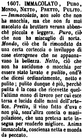 | Immacolato, Puro, Mondo, Netto, Pretto, Pulito - Immacolato, non solo che non ha macchia, ma che non fu mai macolato da bruttura veruna abbenchè piccola e leggera. Puro, ciò che non ha miscuglio di sorta. Mondo, ciò che fu rimondato da una certa corteccia o inviluppo di cose eterogenee che ne appannavano la bellezza. Netto, ciò che non ha sucidume o macchia per essere stato lavato e pulito, ond'è che dicesi ordinariamente, netto e pulito; pulito dunque è più, perchè pulita è la cosa che ricevette quell'ultima mano di lavoro per cui esce tersa e lucida dalle mani dell'artefice. Pretto, il vino fatto d'uva e non più, senz'altra concia o manipolazione, che una pretesa arte insegna per renderlo migliore. Anima immacolata, coscienza netta e monda da peccato. [immagine] |