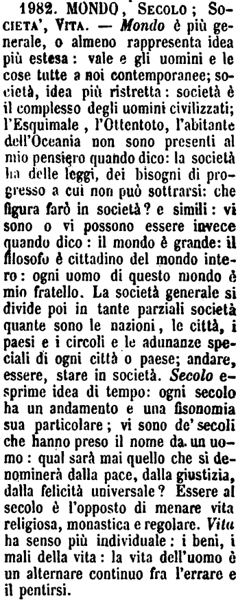 | Mondo, Secolo; Società, Vita - Mondo è più generale, o almeno rappresenta idea più estesa: vale e gli uomini e le cose tutte a noi contemporanee; società, idea più ristretta: società è il complesso degli uomini civilizzati; l'Esquimale, l'Ottentoto, l'abitante dell'Oceania non sono presenti al mio pensiero quando dico: la società ha delle leggi, dei bisogni di progresso a cui non può sottrarsi: che figura farò in società? e simili: vi sono o vi possono essere invece quando dico: il mondo è grande: il filosofo è cittadino del mondo intero: ogni uomo di questo mondo è mio fratello. La società generale si divide poi in tante parziali società quante sono le nazioni, le città, i paesi e i circoli e le adunanze speciali di ogni città o paese; andare, essere, stare in società. Secolo esprime idea di tempo: ogni secolo ha un andamento e una fisonomia sua particolare; vi sono de' secoli che hanno preso il nome da un uomo: qual sarà mai quello che si denominerà dalla pace, dalla giustizia, dalla felicità universale? Essere al secolo è l'opposto di menare vita religiosa, monastica e regolare. Vita ha senso più individuale: i beni, i mali della vita: la vita dell'uomo è un alternare continuo fra l'errare e il pentirsi. [immagine] |