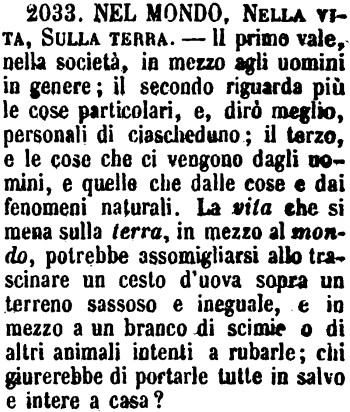 | Nel mondo, Nella vita, Sulla terra - Il primo vale, nella società, in mezzo agli uomini in genere; il secondo riguarda più le cose particolari, e, dirò meglio, personali di ciascheduno; il terzo, e le cose che ci vengono dagli uomini, e quelle che dalle cose e dai fenomeni naturali. La vita che si mena sulla terra, in mezzo al mondo, potrebbe assomigliarsi allo trascinare un cesto d'uova sopra un terreno sassoso e ineguale, e in mezzo a un branco di scimie o di altri animali intenti a rubarle; chi giurerebbe di portarle tutte in salvo e intere a casa? [immagine] |