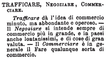 | Trafficare, Negoziare, Commerciare - Trafficare dà l'idea di commercio minuto, ma abbondante e operoso. - Il Negoziare si intende sempre di commercio più in grande, e in paesi anche lontanissimi, e di cose di gran valuta. - Il Commerciare è in genere il Fare qualunque sorta di commercio. [immagine] |