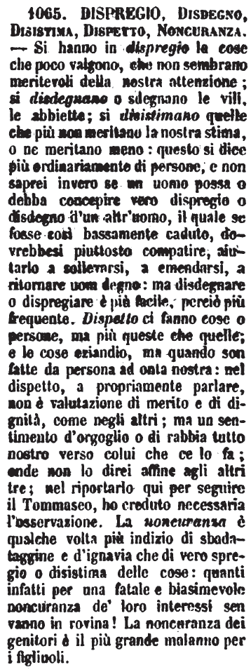 | Dispregio, Disdegno, Disistima, Dispetto, Noncuranza - Si hanno in dispregio le cose che poco valgono, che non sembrano meritevoli della nostra attenzione; si disdegnano o sdegnano le vili, le abbiette; si disistimano quelle che più non meritano la nostra stima, o ne meritano meno: questo si dice più ordinariamente di persone, e non saprei invero se un uomo possa o debba concepire vero dispregio o disdegno d'un altr'uomo, il quale se fosse così bassamente caduto, dovrebbesi piuttosto compatire, aiutarlo a sollevarsi, a emendarsi, a ritornare uom degno: ma disdegnare o dispregiare è più facile, perciò più frequente. Dispetto ci fanno cose o persone, ma più queste che quelle; e le cose eziandio, ma quando son fatte da persona ad onta nostra: nel dispetto, a propriamente parlare, non è valutazione di merito e di dignità, come negli altri; ma un sentimento d'orgoglio o di rabbia tutto nostro verso colui che ce lo fa; onde non lo direi affine agli altri tre; nel riportarlo qui per seguire il Tommaseo, ho creduto necessaria l'osservazione. La noncuranza è qualche volta più indizio di sbadataggine e d'ignavia che di vero spregio o disistima delle cose: quanti infatti per una fatale e biasimevole noncuranza de' loro interessi sen vanno in rovina! La noncuranza dei genitori è il più grande malanno per i figliuoli. [immagine] |