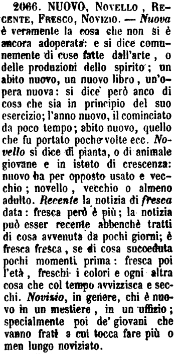 | Nuovo, Novello, Recente, Fresco, Novizio - Nuova è veramente la cosa che non si è ancora adoperata: e si dice comunemente di cose fatte dall'arte, o delle produzioni dello spirito; un abito nuovo, un nuovo libro, un'opera nuova: si dice però anco di cosa che sia in principio del suo esercizio; l'anno nuovo, il cominciato da poco tempo; abito nuovo, quello che fu portato poche volte ecc. Novello si dice di pianta, o di animale giovane e in istato di crescenza: nuovo ha per opposto usato e vecchio; novello, vecchio o almeno adulto. Recente la notizia di fresca data: fresca però è più; la notizia può esser recente abbenchè tratti di cosa avvenuta da pochi giorni; è fresca fresca, se di cosa succeduta pochi momenti prima: fresca poi l'età, freschi i colori e ogni altra cosa che col tempo avvizzisca e secchi. Novizio, in genere, chi è nuovo in un mestiere, in un uffizio; specialmente poi de' giovani che vanno frati a cui tocca fare più o men lungo noviziato. [immagine] |