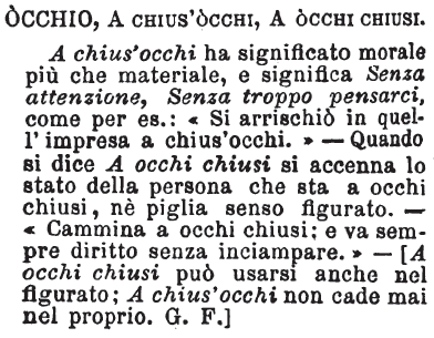 | Occhio, A chius’occhi, A occhi chiusi - A chius'occhi ha significato morale più che materiale, e significa Senza attenzione, Senza troppo pensarci, come per es.: « Si arrischiò in quell'impresa a chius'occhi. » - Quando si dice A occhi chiusi si accenna lo stato della persona che sta a occhi chiusi, nè piglia senso figurato. - « Cammina a occhi chiusi; e va sempre diritto senza inciampare. » - [A occhi chiusi può usarsi anche nel figurato; A chius'occhi non cade mai nel proprio. G. F.] [immagine] |