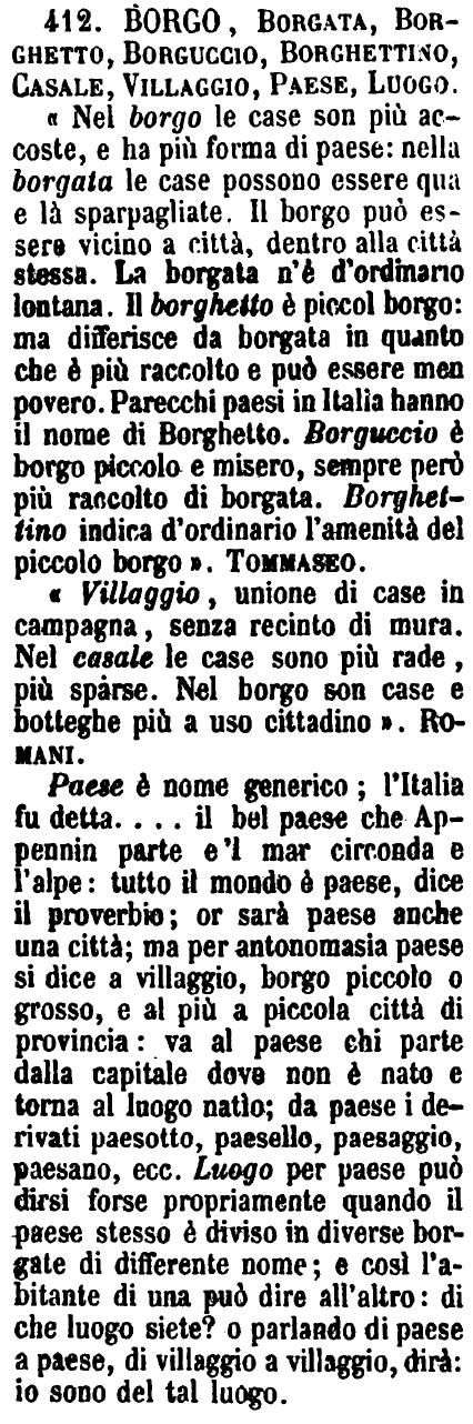 | Borgo, Borgata, Borghetto, Borguccio, Borghettino, Casale, Villaggio, Paese, Luogo - «Nel borgo le case son più accoste, e ha più forma di paese: nella borgata le case possono essere qua e là sparpagliate. Il borgo può essere vicino a città, dentro alla città stessa. La borgata n'è d'ordinario lontana. Il borghetto è piccol borgo: ma differisce da borgata in quanto che è più raccolto e può essere men povero. Parecchi paesi in Italia hanno il nome di Borghetto. Borguccio è borgo piccolo e misero, sempre però più raccolto di borgata. Borghettino indica d'ordinario l'amenità del piccolo borgo». Tommaseo.