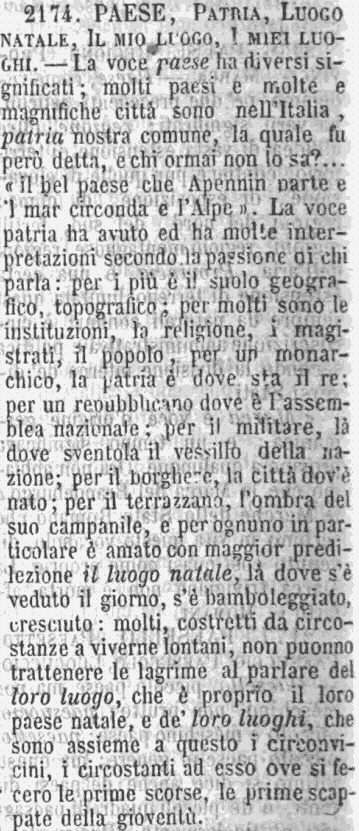 «Villaggio, unione di case in campagna, senza recinto di mura. Nel casale le case sono più rade, più sparse. Nel borgo son case e botteghe più a uso cittadino». Romani. Paese è nome generico; l'Italia fu detta....il bel paese che Appennin parte e 'l mar circonda e l'alpe: tutto il mondo è paese, dice il proverbio; or sarà paese anche una città; ma per antonomasia paese si dice a villaggio, borgo piccolo o grosso, e al più a piccola città di provincia: va al paese chi parte dalla capitale dove non è nato e torna al luogo natìo; da paese i derivati paesotto, paesello, paesaggio, paesano, ecc. Luogo per paese può dirsi forse propriamente quando il paese stesso è diviso in diverse borgate di differente nome; e così l'abitante di una può dire all'altro: di che luogo siete? o parlando di paese a paese, di villaggio a villaggio, dirà: io sono del tal luogo. [immagine] |
